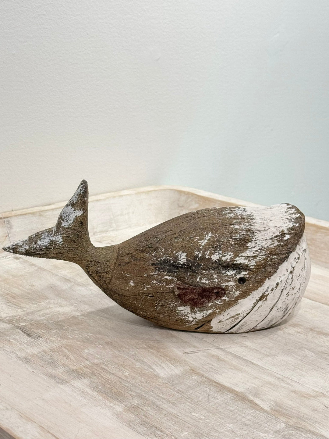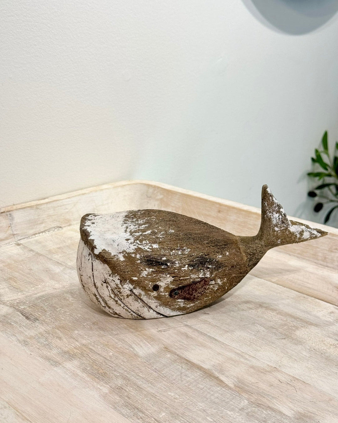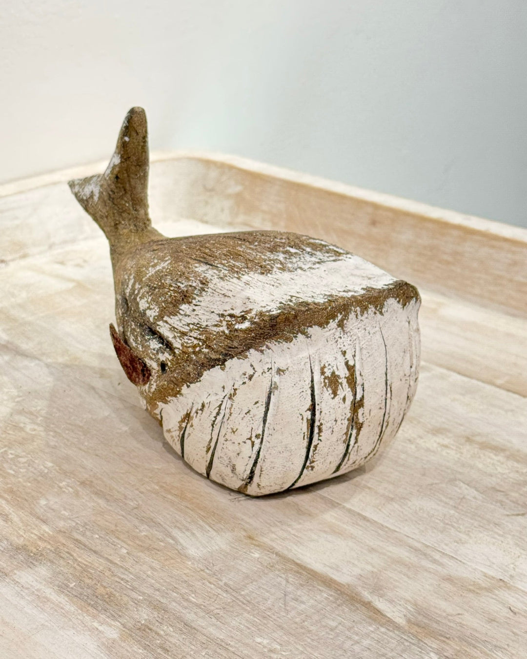 This lovely weathered wooden whale will add a bit of rustic, coastal charm to any space.