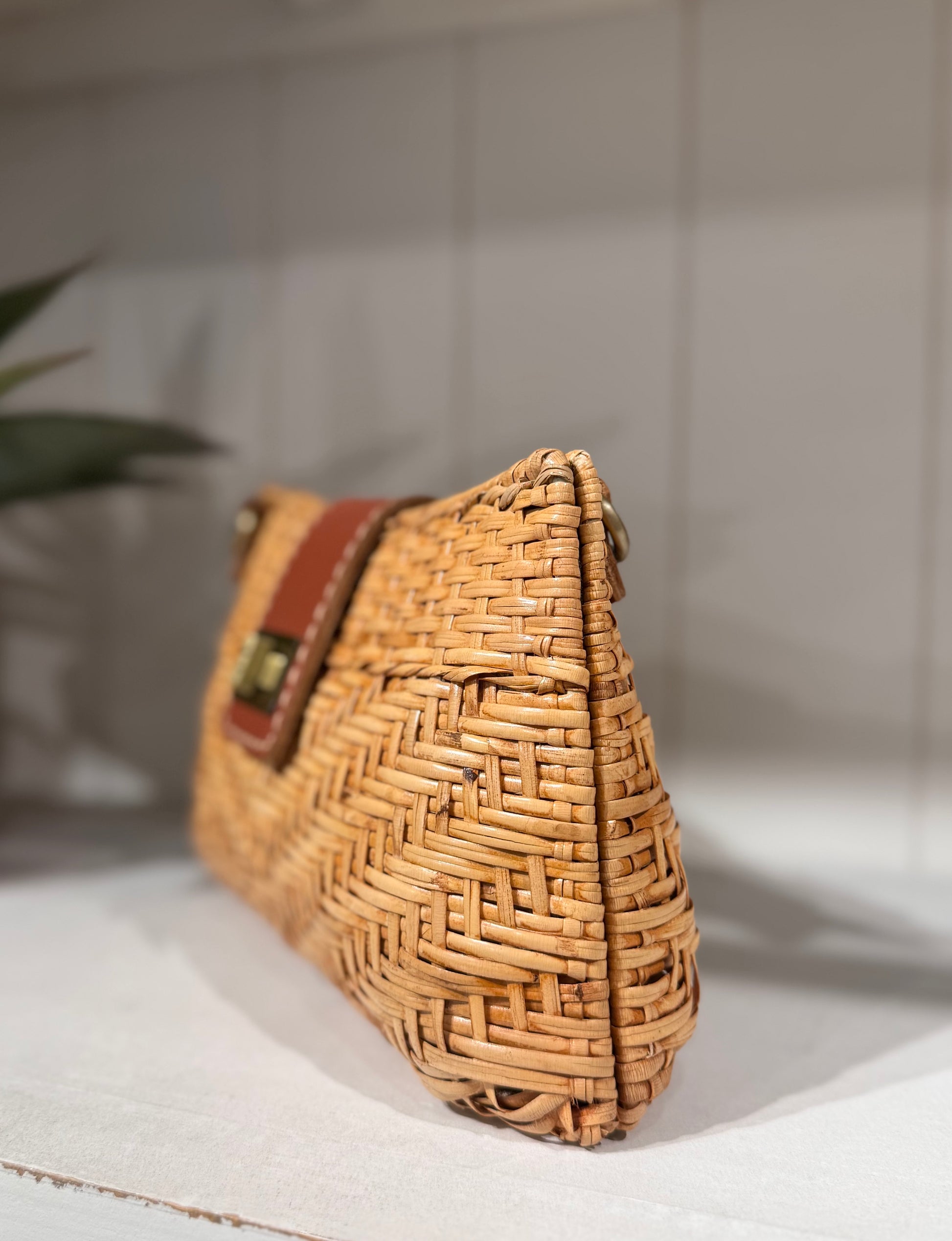 Handcrafted in Indonesia, this beautifully woven wicker bag blends artisanal texture with rich espresso-toned leather detailing. Designed with a full lining and finished with a brass twist-lock closure, it can be worn crossbody or carried as a clutch fro evenings out.